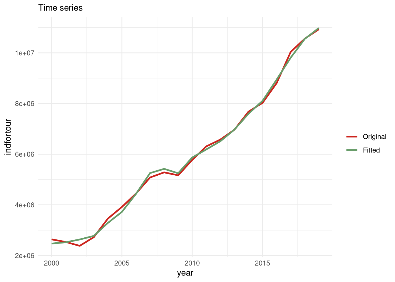 The R² and adjusted R² are very high meaning our model fits indfortour well. They explain more than 99% of the variation in indfortour.